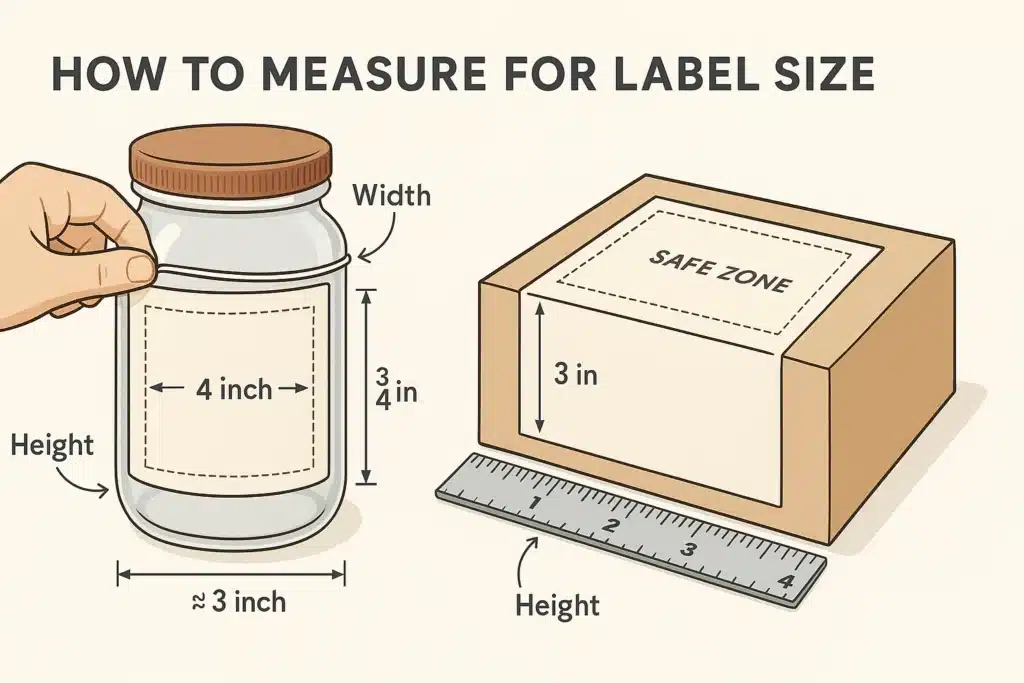 For round containers, use a string or cloth measuring tape to wrap around the area where the label will sit. For flat surfaces, a ruler works. Always subtract about 1/8″ (or 0.125″) from both dimensions to give yourself a buffer.