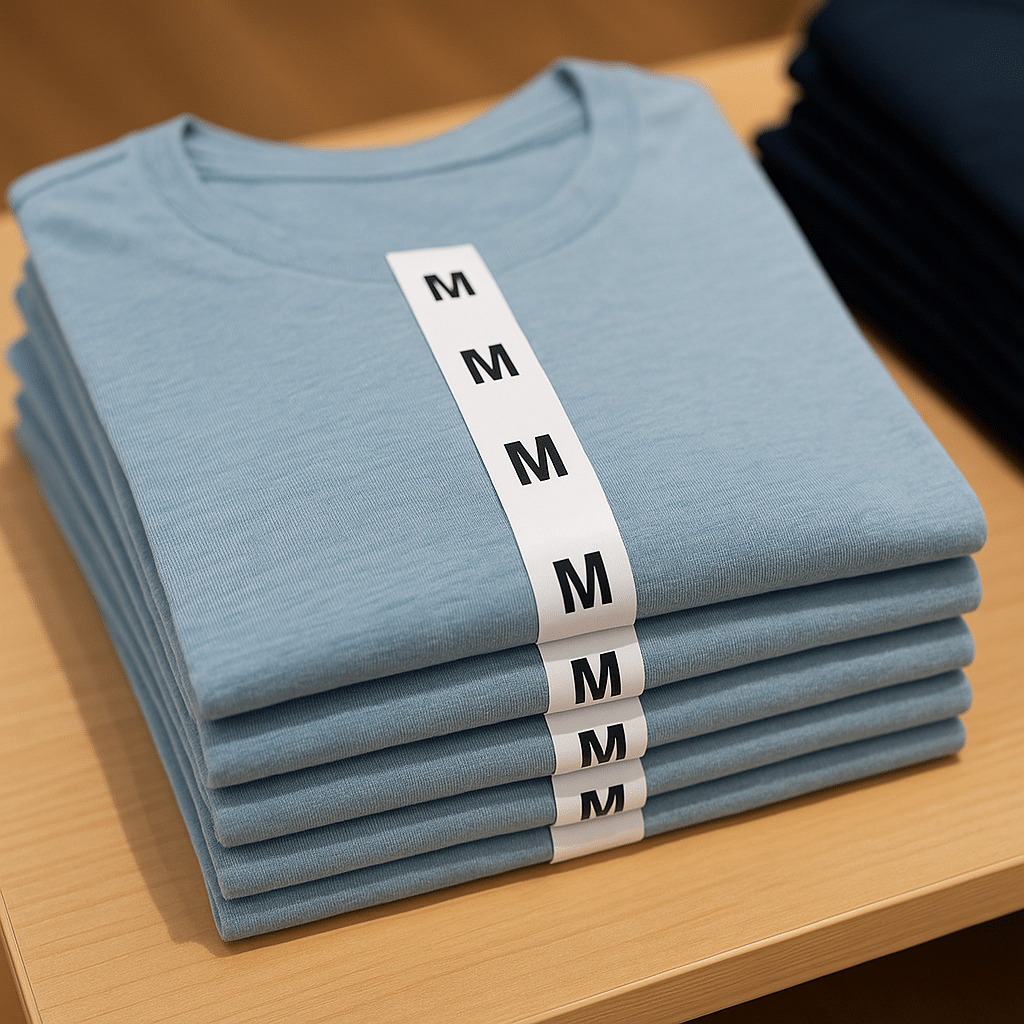 Stick the size label on the front fold—ideally centered and a few inches below the collar or neckline. This keeps everything aligned and easy to scan at a glance. You’ll avoid the messy “dig and toss” that ruins a table in five minutes.