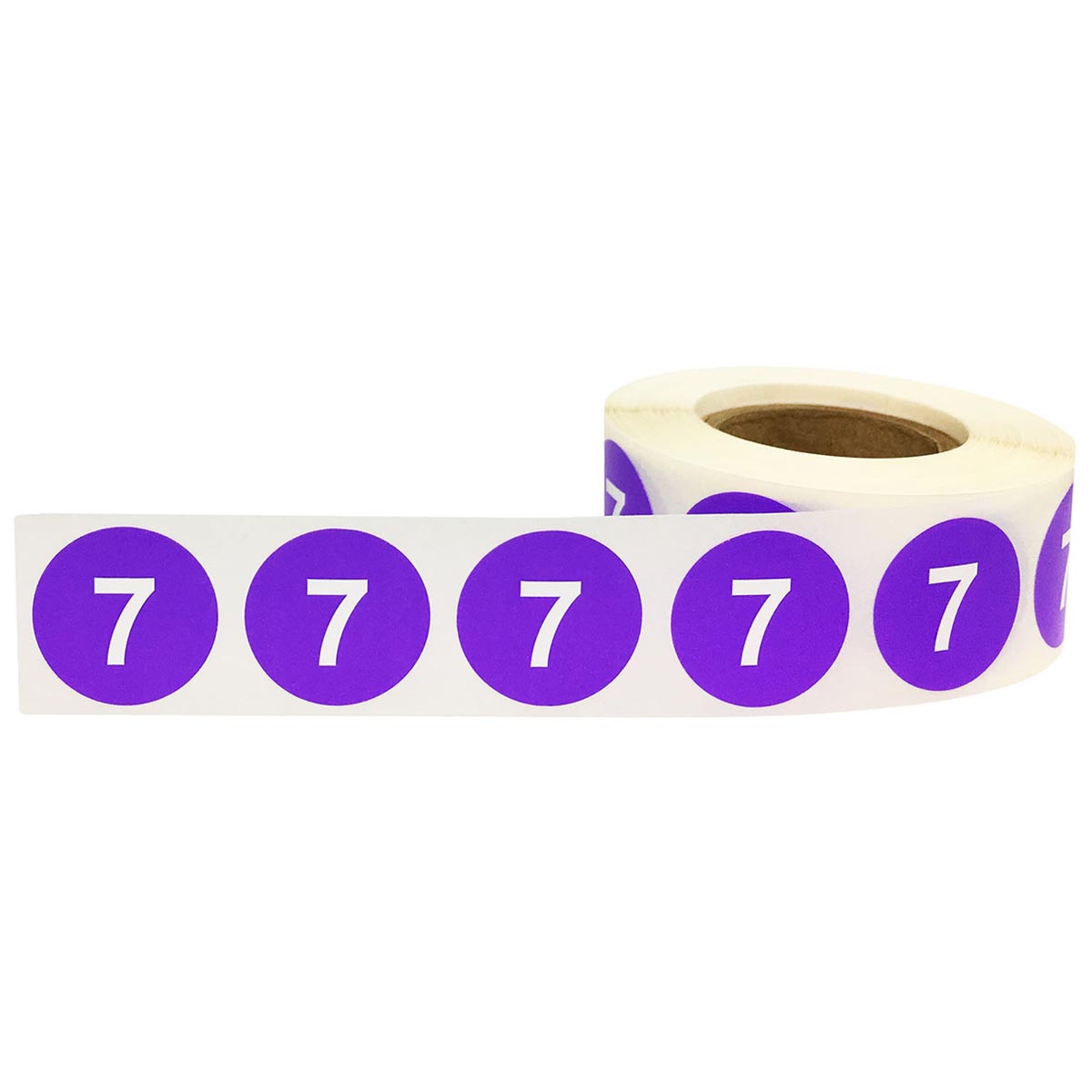 These are our 3/4 inch round color-coding number 7 stickers. There are 500 adhesive number labels on a roll though we do add about 15 extra. Made of a semi-gloss paper, they have a standard permanent adhesive and will stick to most surfaces. They are removable depending on what material they are on and how long they’ve been there. The longer they stay the more likely they may leave some residue.Â