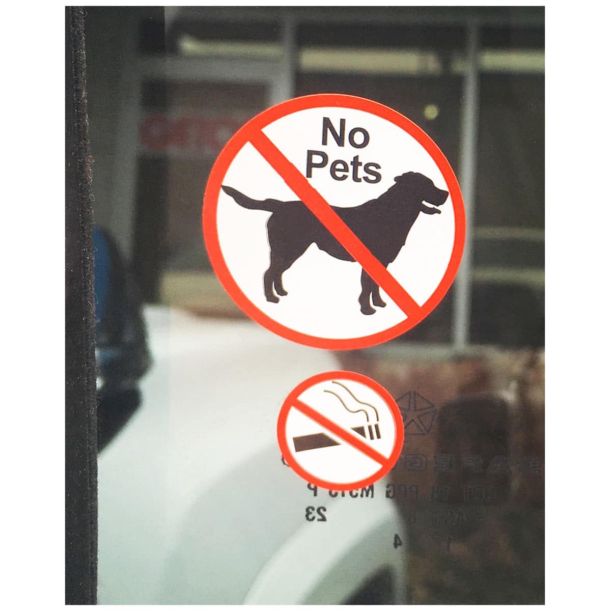 These are white semi-gloss stickers with a red eco-friendly print that says “No Pets.” They have the red cross-out symbol for “no” and a picture of a dog. You can put these on anything from doors to the inside of cars and anywhere else you may need them. They have a very unique design and will look great on anything you place them on.