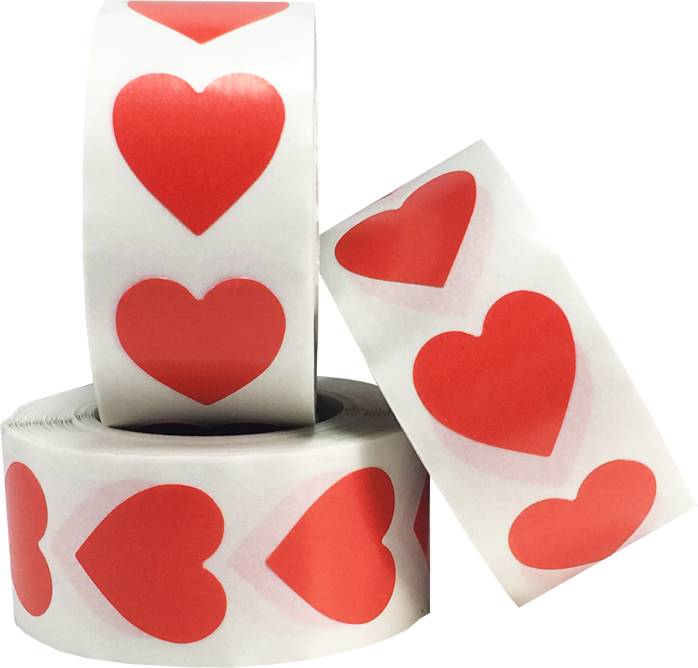 This is our three-pack of 3/4 inch red heart stickers. You receive 1,500 total heart labels with 500 on each roll (three total rolls). Check out these small hearts as well!
