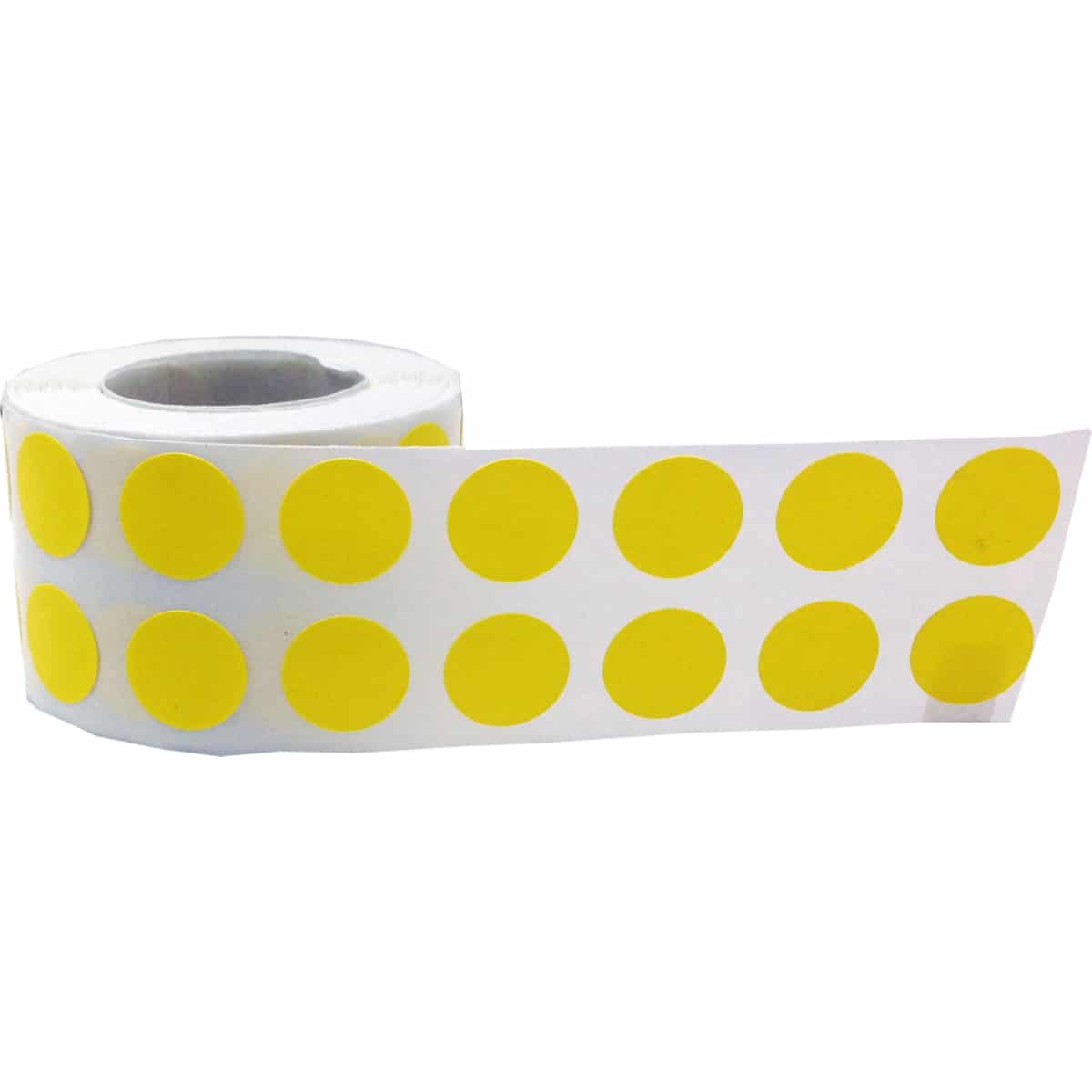 These small 1/2 inch hot yellow dot stickers are perfect for color-coding and a quick peel and stick on almost anything. These re-adjustable labels are removable when needed without leaving residue. There are 1,000 color coding dots on a roll. They measure at 1/2 inch in diameter, or 1/2 inch round. We do have color-coding dot stickers on sheets if needed. These 1/2 inch hot yellow dot stickers are semi-gloss paper with a back adhesive that will stick to almost anything, such as glass, corrugated boxes, charts, library books, laptops, and much more. We use eco-friendly water-based ink for the color print.