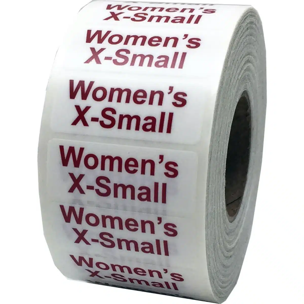 Women’s Ultra Clear Size Strip Labels with Maroon Print for Shirts 1.25″ x 5″ QTY 125